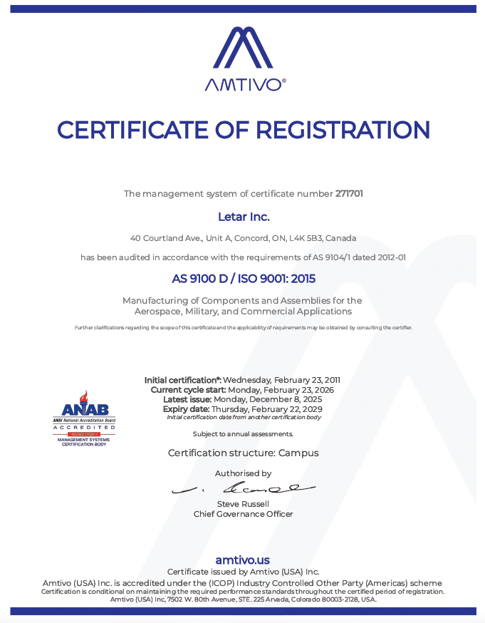 LETAR’s Quality Management System is ISO 9001:2015 and AS9100 Rev. D certified.